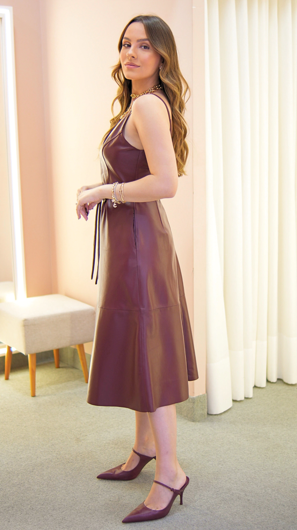 VESTIDO DE COURO DAISE ACOMPANHA UM CINTO COM FIVELA MODERNA DOURADO, RECORTE EVASÊ, ALÇAS DELICADAS E DECOTE DE BUSTO NA ALTURA CERTA.